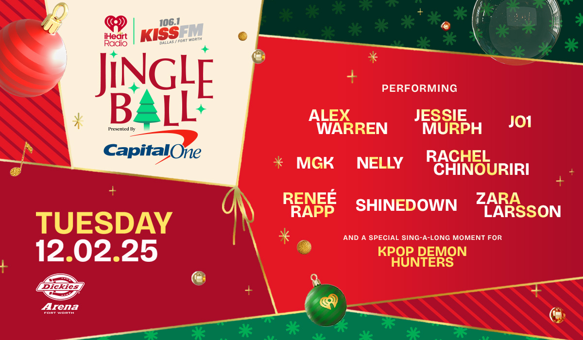 106.1 KISS FM, DFW’s #1 Hit Music Station, today unveiled the star-studded lineup for its annual holiday concert, iHeartRadio 106.1 KISS FM’s Jingle Ball 2025 Presented by Capital One, taking place on Tuesday, December 2 at 7:30pm CST at Dickies Arena. 106.1 KISS FM’s Kidd Kraddick Morning Show officially announced the all-star performers for iHeartRadio 106.1 KISS FM’s Jingle Ball 2025 Presented by Capital One which will include Alex Warren, Jessie Murph, mgk, Nelly, Reneé Rapp, Rachel Chinouriri, Shinedown, Zara Larsson and a special sing-along moment for KPOP Demon Hunters.