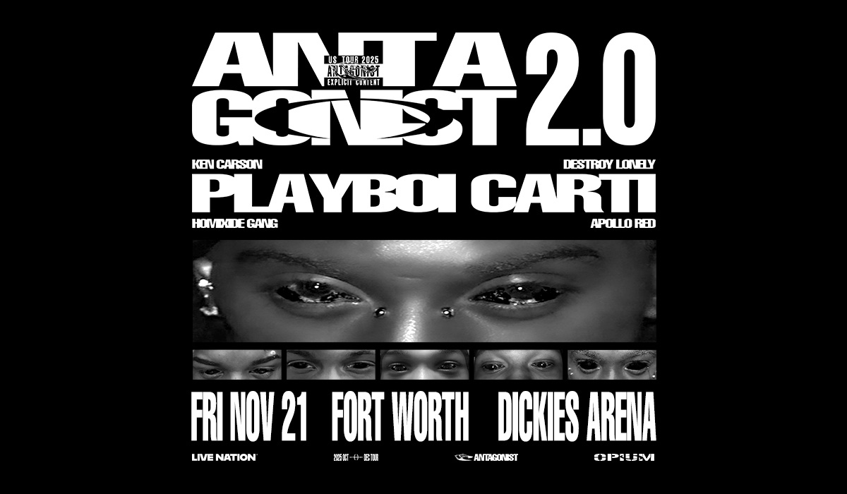 Playboi Carti is bringing his ANTAGONIST TOUR to Dickies Arena on Friday, November 21, 2025, with special guests Ken Carson, Destroy Lonely, Homixide Gang, and Apollo Red.